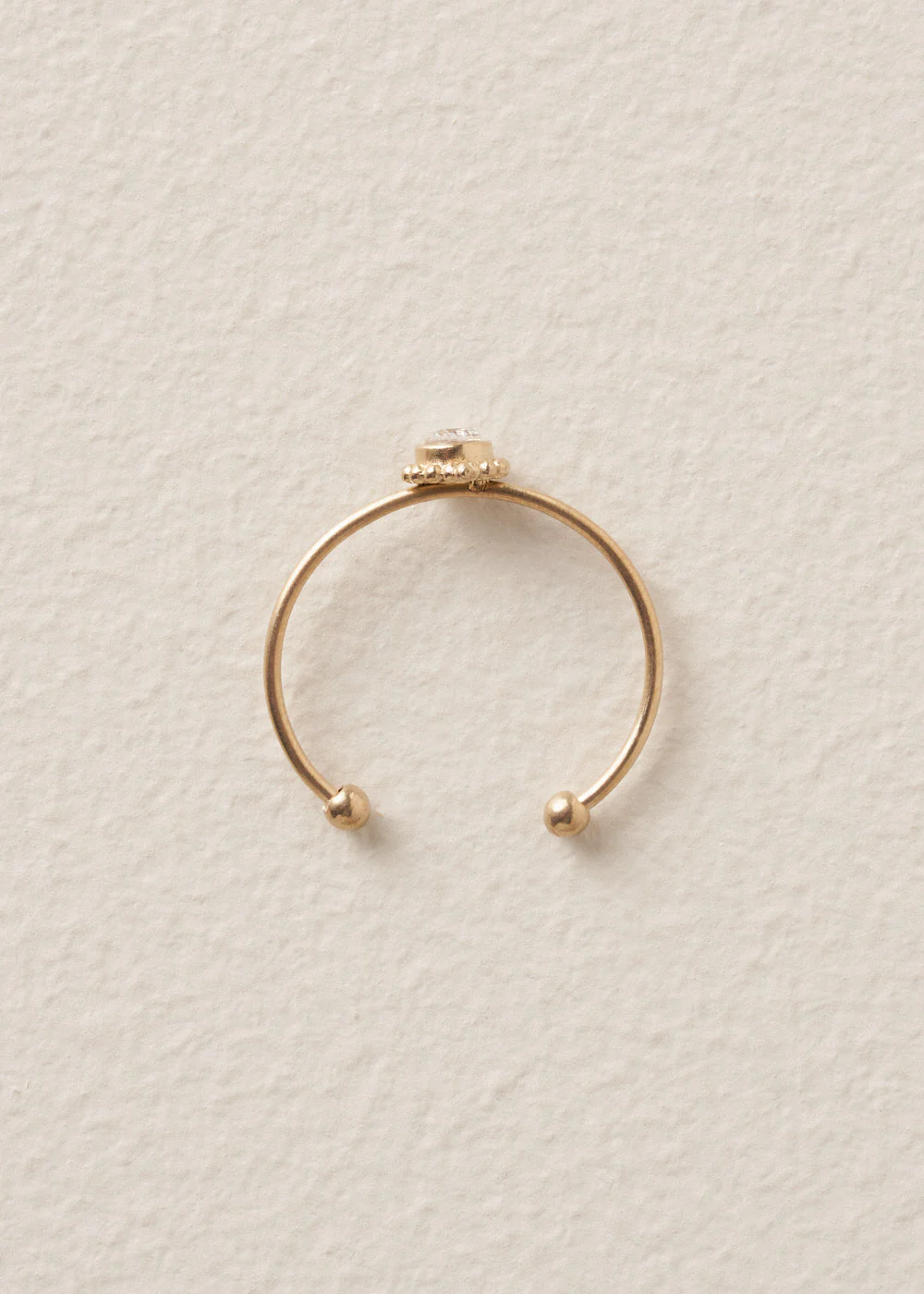 The Basil Ring features a slender gold band, a twinkling clear crystal at the centre, accented with delicate balled detailing. Subtle yet striking, it’s a refined finishing touch.