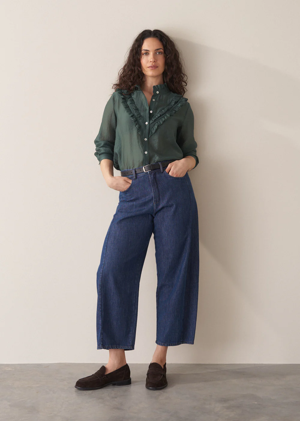 The Bella Shirt is cut from a soft, lightweight semi-sheer fabric in dark green. With a frilled grandad collar, delicate ruffle details and mother-of-pearl buttons, itβs a subtle yet statement piece to take from day to night.