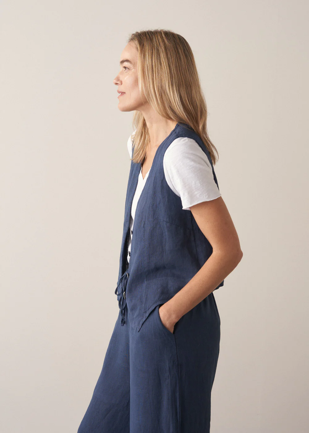The Bronte Waistcoat, crafted from lightweight linen in a rich navy hue, is perfect for versatile, cross-seasonal styling. Wear it buttoned up as a sleek, sleeveless top or leave it open for a relaxed, layered look.