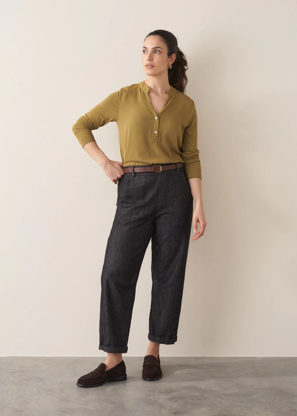 A cross-seasonal staple, the versatile Candice Top, with its slim fit and soft jersey sleeves, can be worn as a stand-alone blouse or a fuss-free layering piece.