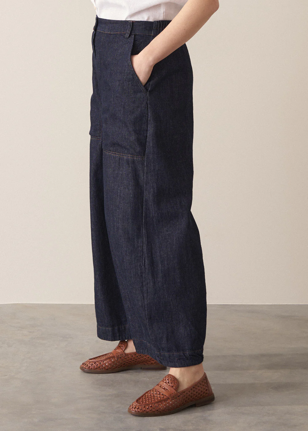 The Elizabeth trousers merge classic utility detailing with the ease of a barrel-leg silhouette. Cut from lightweight denim, they’re soft, practical and designed for effortless, everyday versatility.