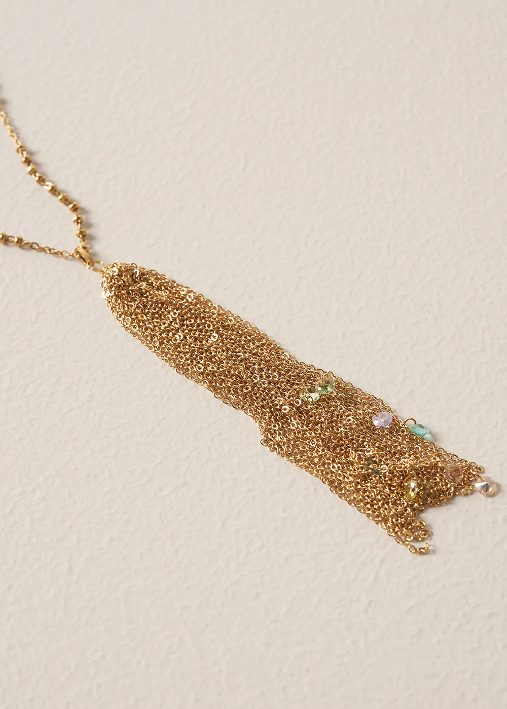 The Lavinia necklace features a long chain elegantly accented with gold beads and finished with a pendant of multiple strands and colourful crystals.