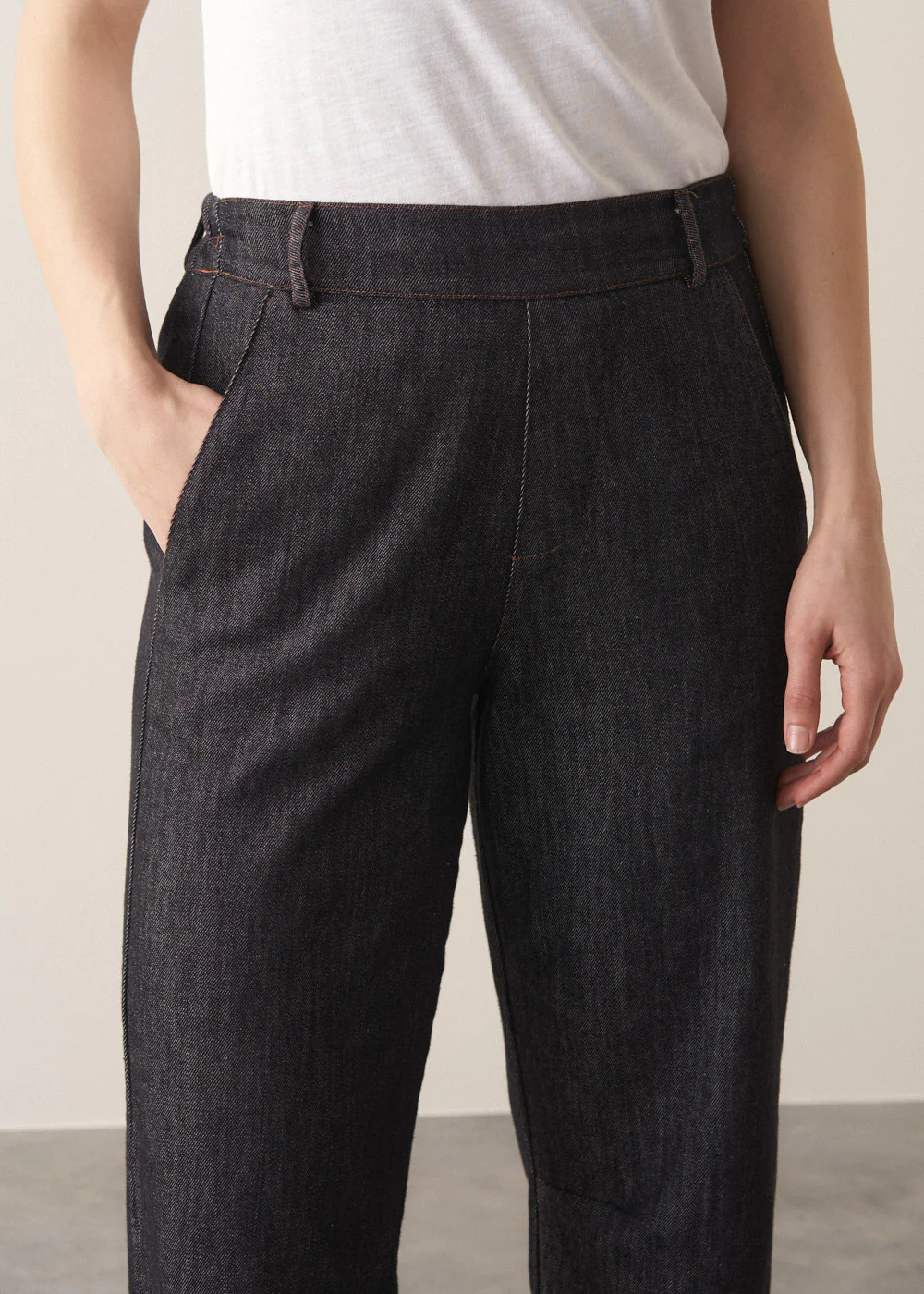 A timeless staple, every wardrobe needs a great pair of jeans. The Norah Trousers, crafted from beautifully soft cotton in a rich blue-black hue, offer the ideal blend of comfort and versatility. Designed with an elasticated waist, they combine the ease of cotton trousers with the timeless appeal of classic denim.