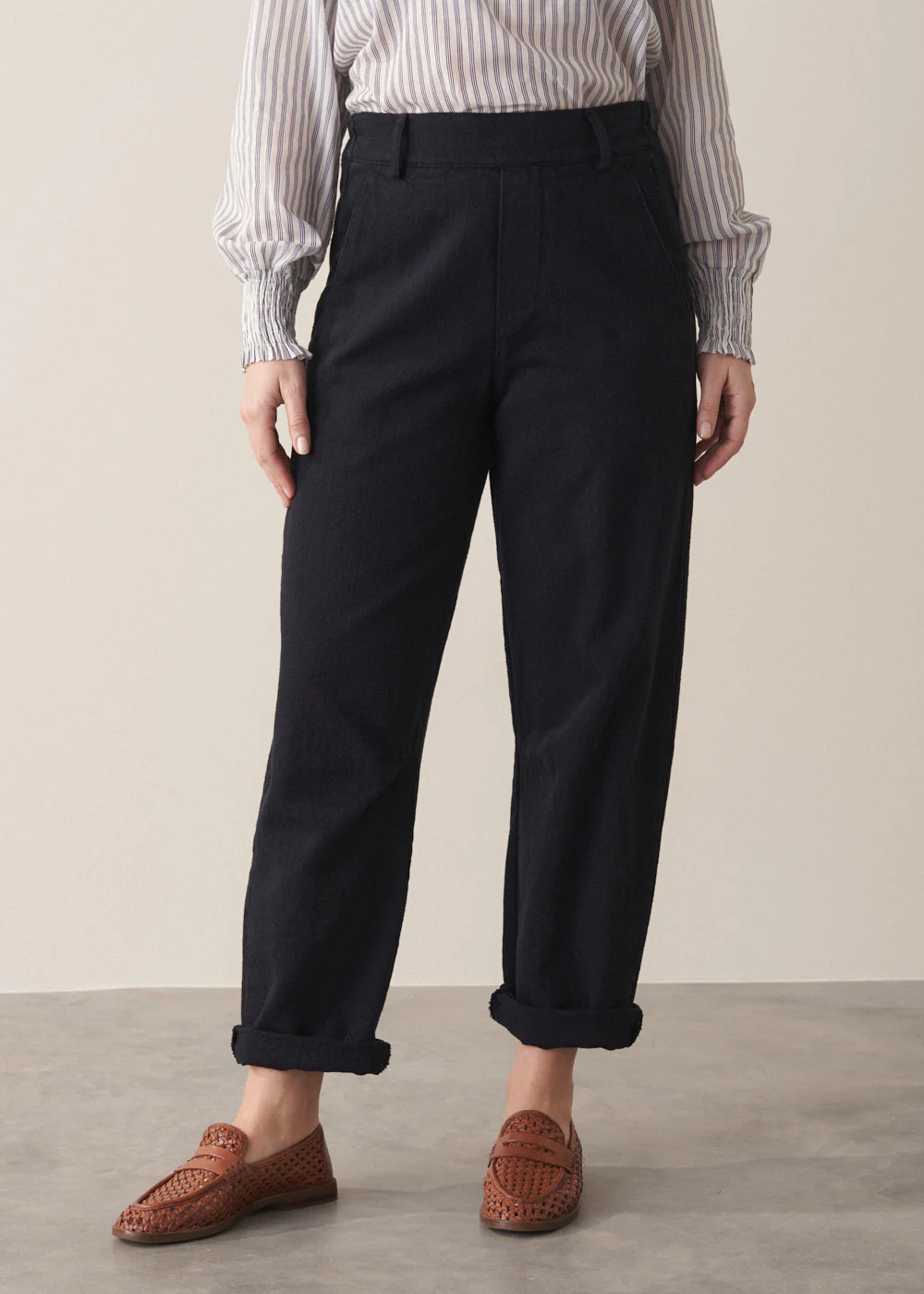 A Busby & Fox staple, the Norah Trousers return in a true black finish. Crafted from beautifully soft cotton, they offer comfort and versatility. Designed with an elasticated waist, the Norahs combine the ease of cotton trousers with the timeless appeal of classic denim.