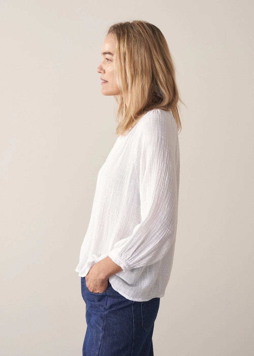 Made from soft, lightweight cotton, the Safia top is a relaxed-fitting blouse with a comfortable, laid-back feel. It features a simpleĀ A-line shape and 3/4-length raglan sleeves.