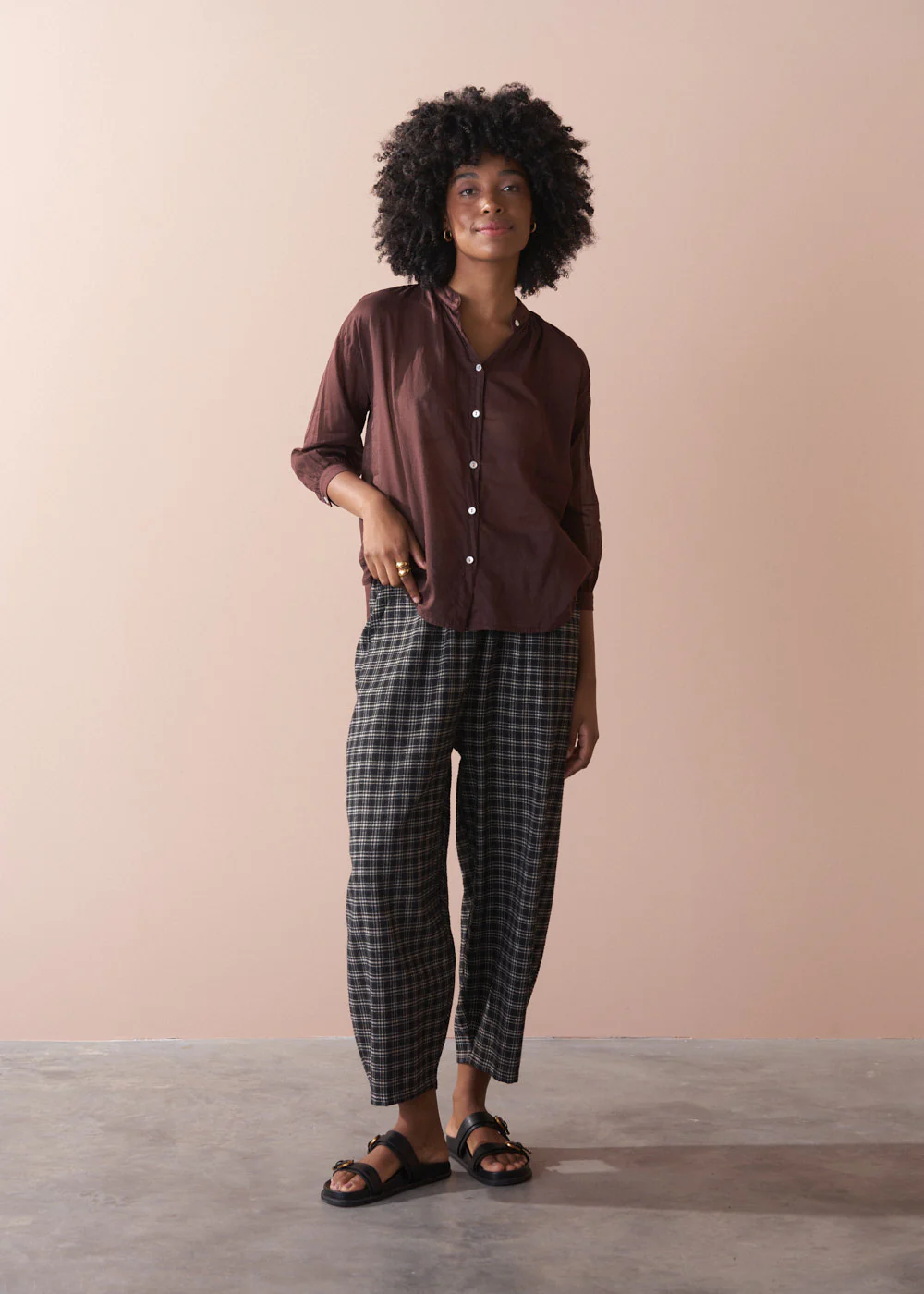 The Yvette Shirt is a lightweight, relaxed style crafted from sheer cotton in a rich dark brown. Its soft-focus finish brings an airy elegance, while the contrasting orange stitching on the buttons adds a considered pop of colour. Â